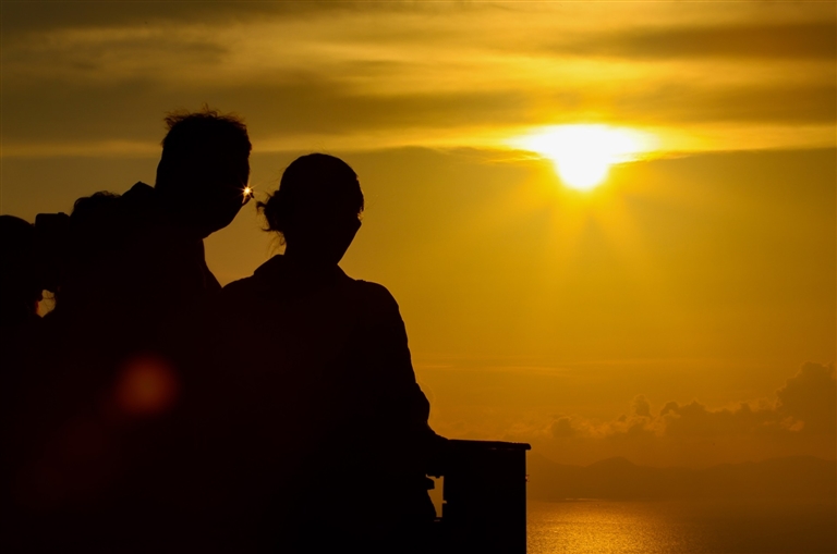 5月17日,在三亚鹿回头风景区,市民游客在山顶观看日落。