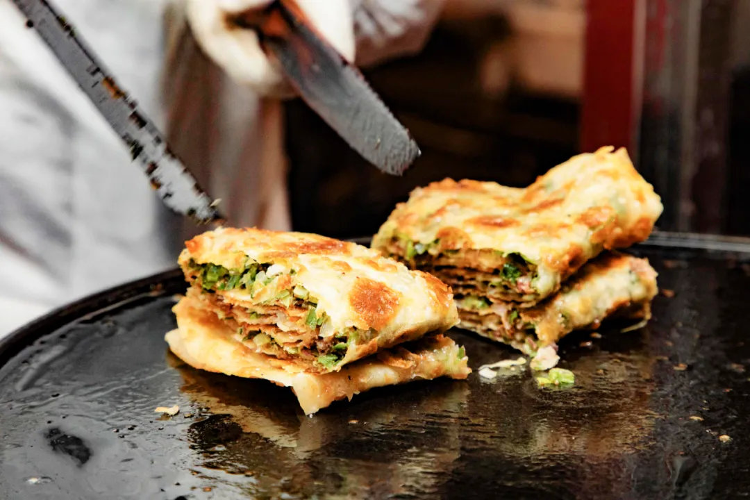羊肉炕馍是名副其实的夜市宠儿,烙饼里夹上五香烧羊肉、蒜苗和白菜,羊油的香味散发出来,好不诱人!