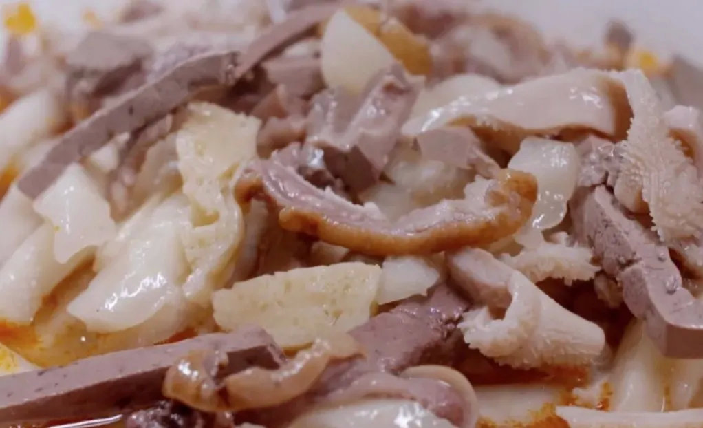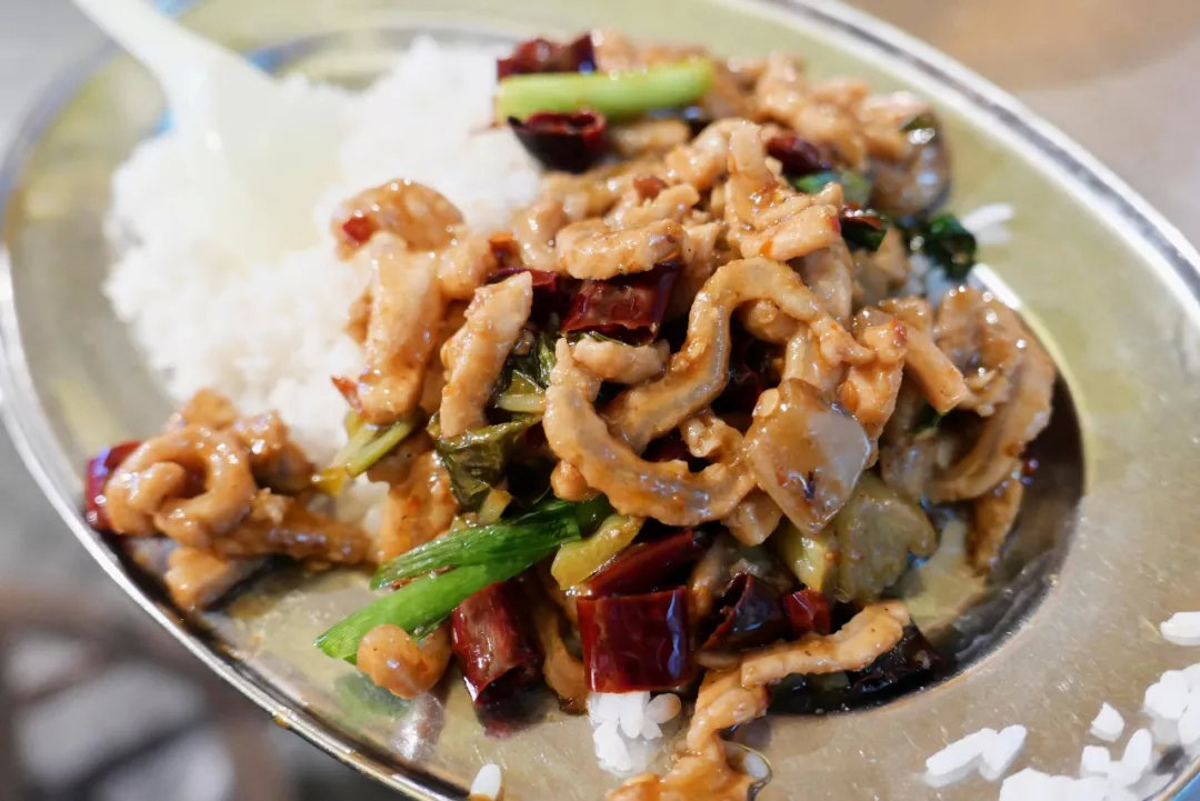 贵阳人爱吃猪板筋,他们把这份情节带进了盖饭里。夜幕下,猛火颠锅炝炒,板筋、蒜苗、辣椒在锅中翻飞,猪板筋吃口软糯,还很下饭。