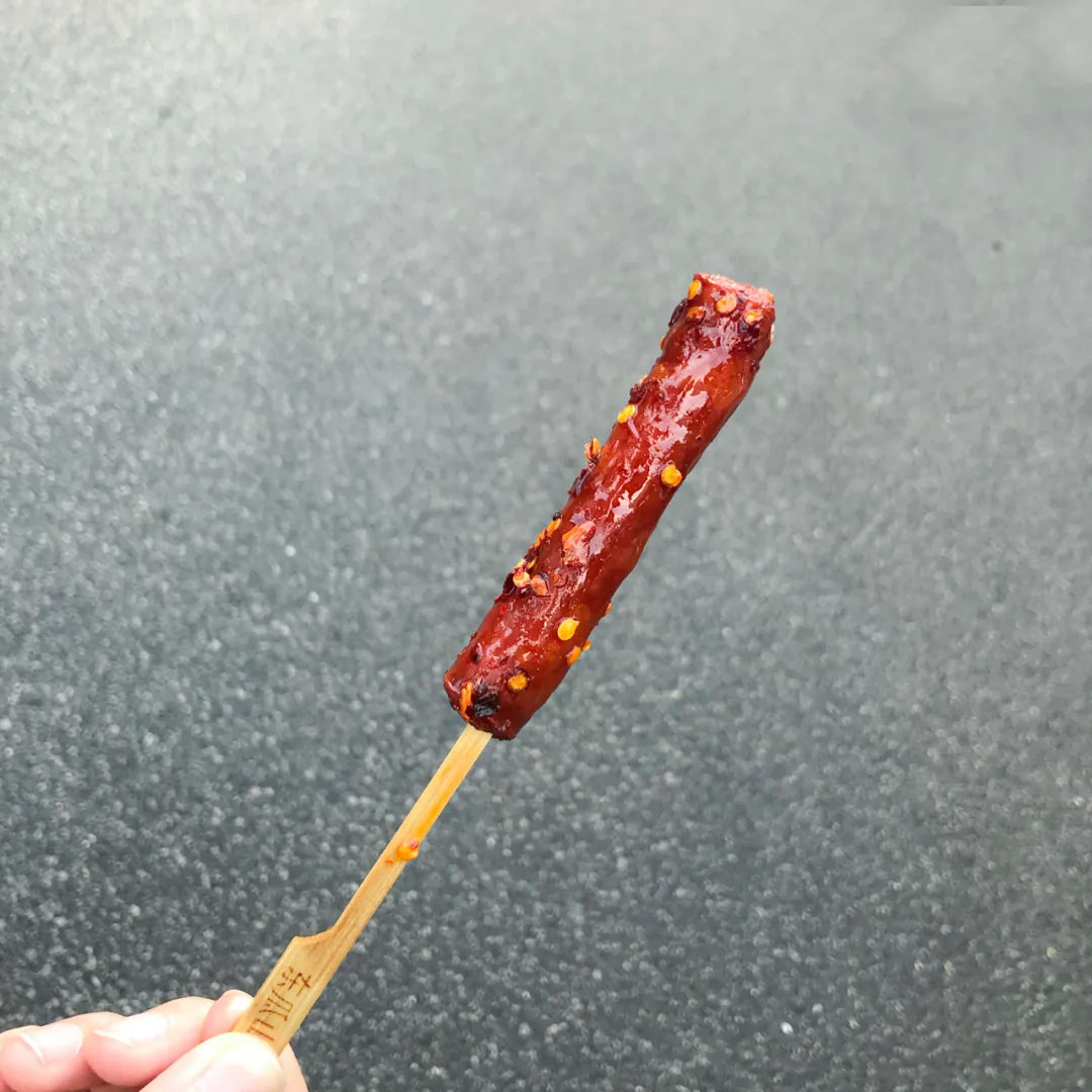 外观看上去像腊肠,但其实是鲜肉肠,烤熟后撒上特制辣椒碎,外层烤得焦焦的,内里的肉汁一口爆浆,口感扎实有劲,鲜香麻辣。