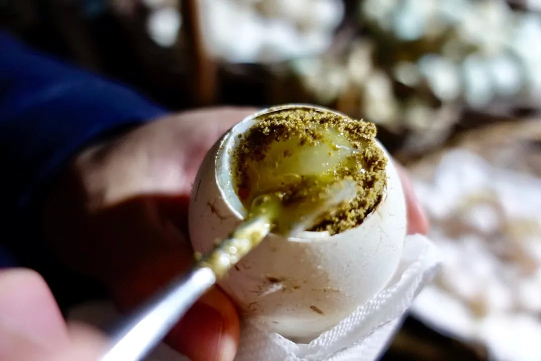 其中最关键的还是火候,比如鹅蛋一定要吃七分熟的,敲开后撒上一小撮孜然,用小勺拌开,溏心混合着刚刚凝固的蛋白,有一种流动的胶质感。还有更补的营养蛋,在鹅蛋里加上蜂蜜、玛咖和藏红花,口感还挺新奇的。
