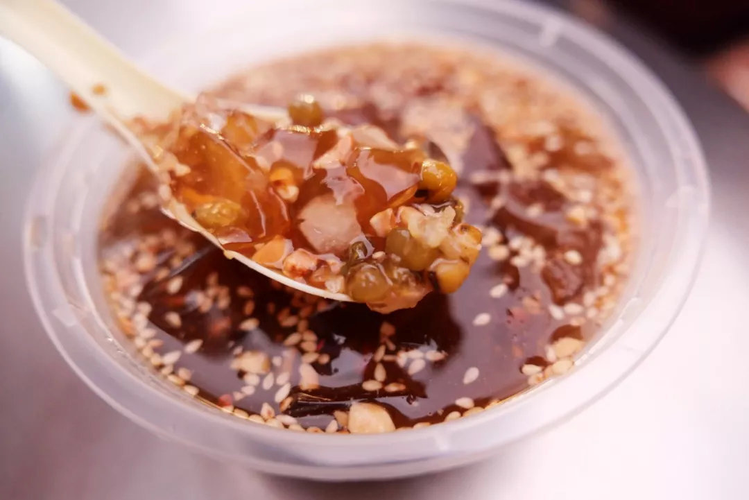 夜宵后,总得来碗糖水才妥帖。把冰镇绿豆汤和冰粉结合在一起的绿豆冰粉,是创新的解暑新吃法。
