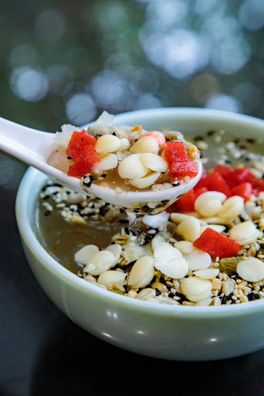 逛热了来杯凉杏茶,用藕粉和杏仁粉调制,加上黑白芝麻、葡萄干、瓜子、杏仁片等多种配料,冰冰凉凉,特别扎实。