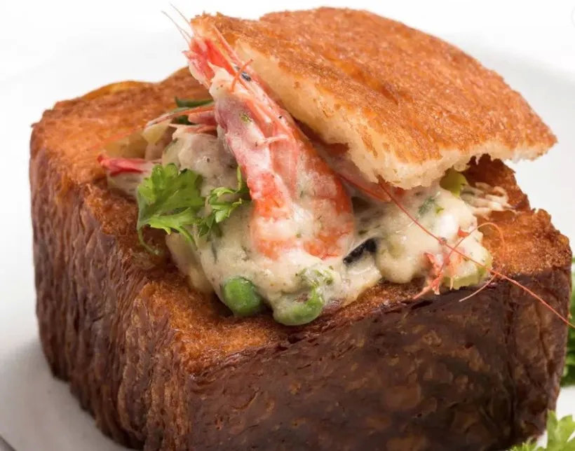 这里能打卡到台南经典小吃棺材板,取这个名字是因为炸制过的吐司面包,外形和色泽都很像台湾南部的松木棺材。内馅则是爆炒好的猪肝片、洋葱、腊肠片和年糕片。