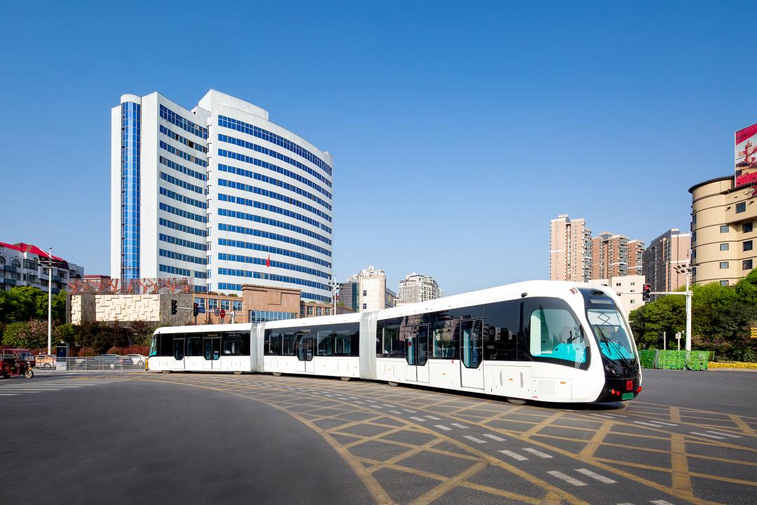 △2017年10月23日,由中国中车株洲研究所自主研发的全球首列智轨列车在“中国电力机车之都”株洲实现上路运行。(图/视觉中国)