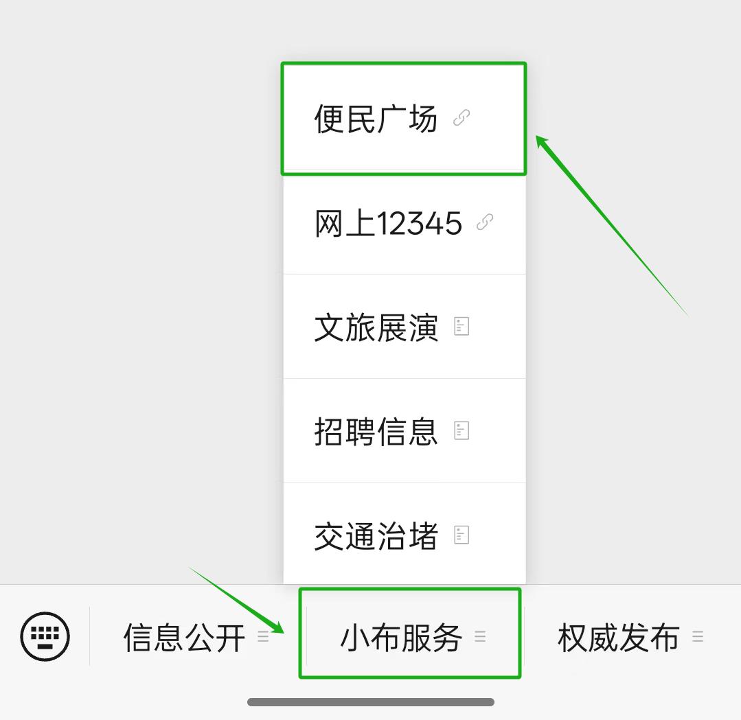 在“成都发布”微信公众号主页聊天对话框正下方找到“小布服务”-“便民广场”