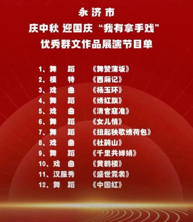 一、10月1日14:30在鹳雀楼景区广场、10月3日14:30在普救寺广场举办庆中秋 迎国庆“我有拿手戏”优秀群文作品展演;