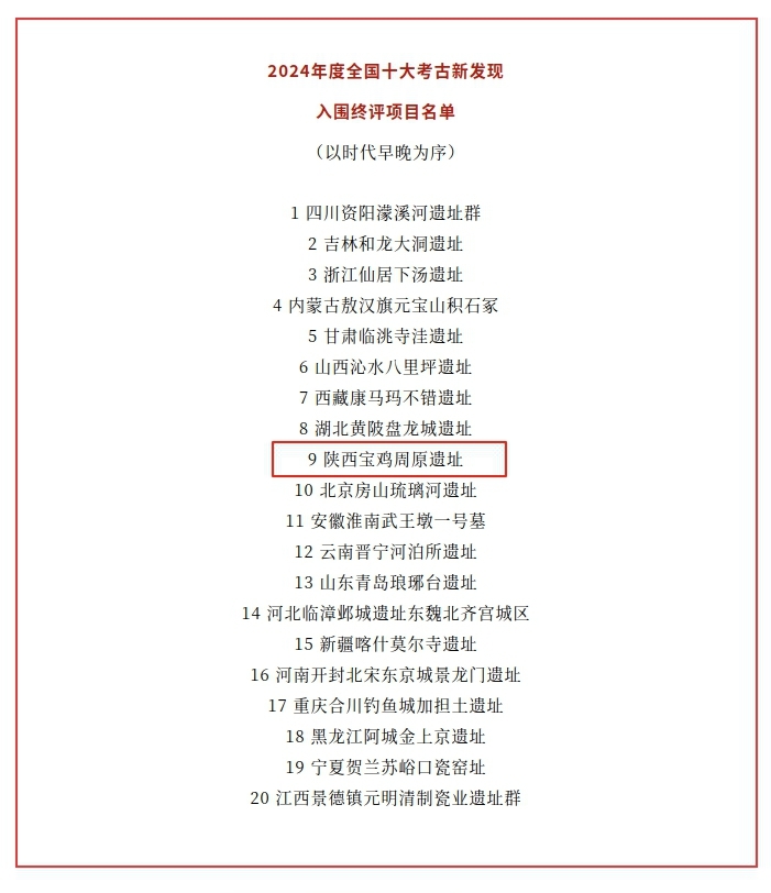 3月31日,“2024年度全国十大考古新发现初评结果揭晓根据投票结果,20个项目入围终评。其中,“陕西宝鸡周原遗址入围终评项目名单