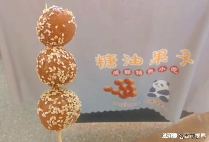 糖油果子是四川省成都市的一道传统小吃,是青石桥三绝之一;其特点是色泽黄亮,外酥内糯,香甜可口。糖油果子以糯米、红糖和芝麻为原料,将糯米粉团在油中炸制后裹上白芝麻并用竹签穿起来。一串有四五颗左右,每串约3~5元钱。每一颗糖油果子浑圆光亮,呈棕红色,有焦糖香味,表面有喷香的白芝麻,咬下去皮脆内软,更有炸的好的果子里面是空心的。微带酸味的粘软糯米和焦脆香甜的外皮和着白芝麻嚼在嘴里,越吃越有味道。