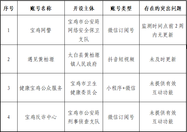 (二)个别单位未严格落实政务新媒体监管责任。宝鸡市交通警察管理支队“宝鸡交警”抖音短视频、宝鸡市市场监督管理局“宝鸡市市场监管”今日头条开设主体名称与“全国政务新媒体信息报送系统”所填报的开设主体名称不一致,宝鸡市市场监督管理局“宝鸡市场监管”新浪微博点赞与本单位业务无关的信息,凤翔区发展和改革局“凤翔发改”,凤翔区柳林镇人民政府“醉美柳林”开设主体未使用规范全称。