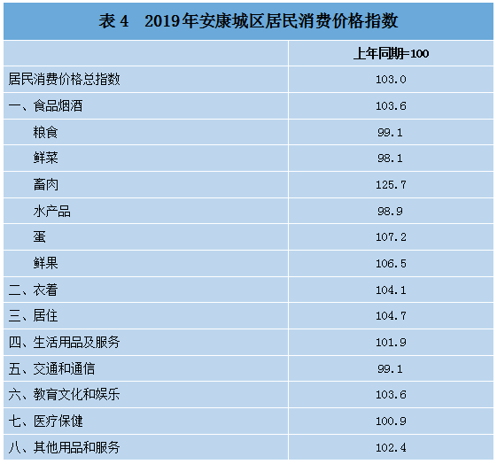 2019年,安康城区居民消费价格比上年上涨3%。商品零售价格比上年上涨1.9%。