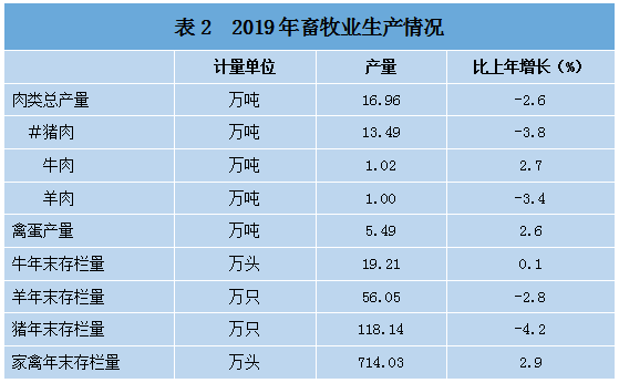 全年生猪出栏177.38万头,下降4.0%;牛出栏6.47万头,增长3.7%;羊出栏54.71万头,下降1.5%;家禽出栏835.51万只,增长7.5%。肉类总产量16.96万吨,下降2.6%。禽蛋产量5.49万吨,增长2.6%。