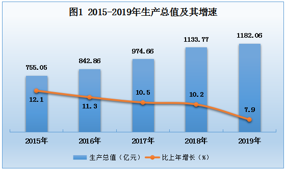 初步核算,全年生产总值(GDP)1182.06亿元,比上年增长7.9%。其中:第一产业增加值137.52亿元,增长4.3%;第二产业增加值553.93亿元,增长10.7%;第三产业增加值490.61亿元,增长6.0%。一、二、三产业增加值占GDP的比重为11.6 :46.9 :41.5。人均生产总值44241元,比上年增长7.7%。