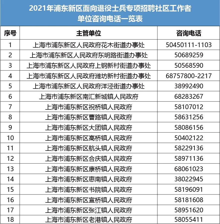 报考人员需要咨询岗位条件、资格审查、面试等相关内容,请直接与招聘单位联系,咨询电话详见《2021年浦东新区面向退役士兵专项招聘社区工作者招聘单位咨询电话一览表》。