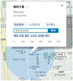 信息窗提供“周边查询”、“公交查询”、“驾车查询”和“收藏”的功能,还提供位置信息的详情。