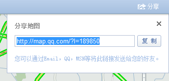 在地图右上角点击分享,可以复制当前地图信息的链接,通过Email,QQ,MSN等将此链接发送给您的好友。