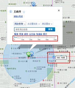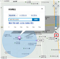 在弹出的周边查询信息窗的搜索框中输入要查找的周边位置信息,可通过滑尺或者拖动半径调整周边范围大小。
