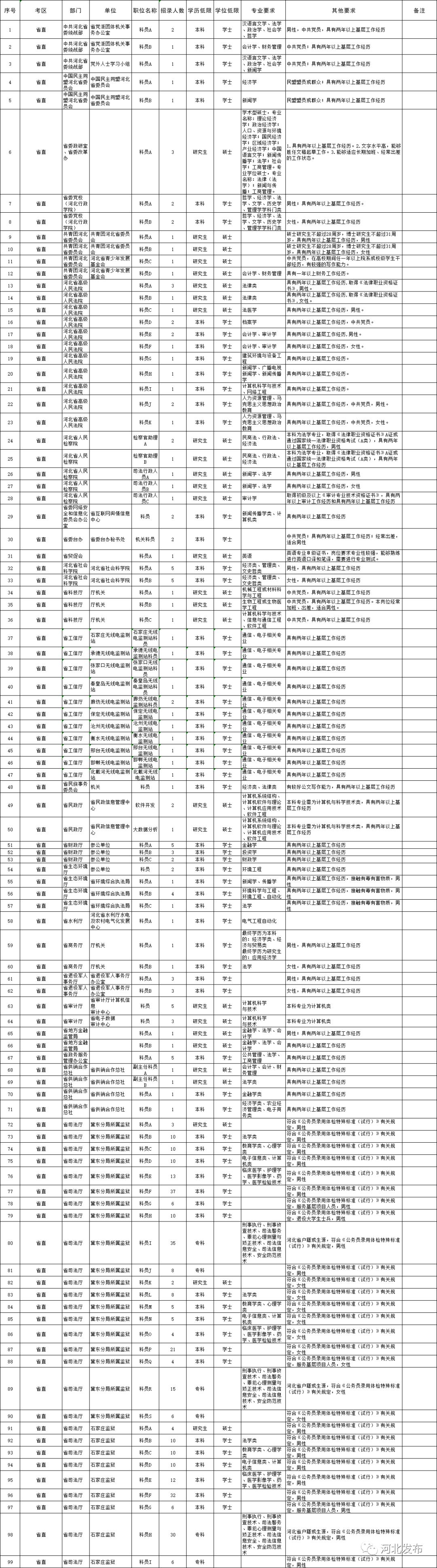 2、招录职位条件中要求的报考者为“退役大学生士兵”是指以下两类人员:一是2013年及其以后从河北省应征入伍、2018年退伍、入伍前已取得全日制本科以上学历的退役士兵;二是2013年及其以后从河北省应征入伍、退役后复学、2019年应届毕业的全日制本科以上学历的退役士兵。“大学生退役士兵”名单由省级主管部门提供。