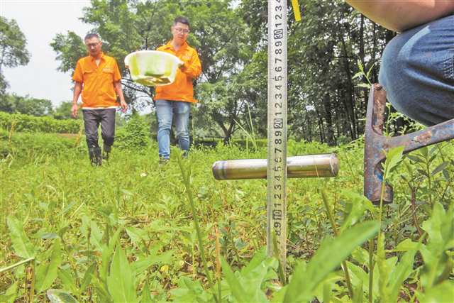 南岸区土壤采样点,工作人员将钢钎插入土壤中测量土层厚度。记者 张锦辉 摄/视觉重庆