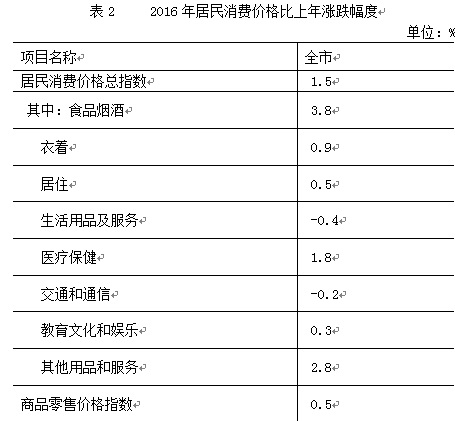 全年居民消费价格总水平上涨1.5%。其中,城市上涨1.5%,农村上涨1.4%。