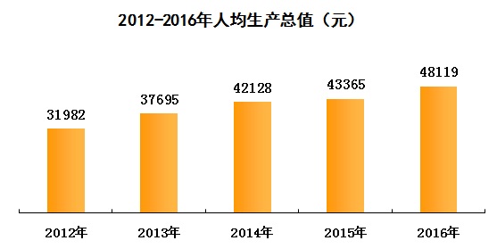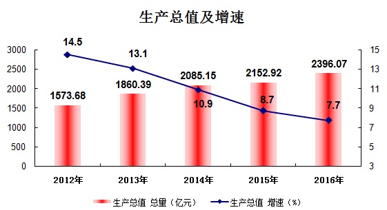 初步核算,全年生产总值2396.07亿元,按可比价格计算,比上年增长7.7%。其中,第一产业增加值345.32亿元,增长3.8%,占生产总值的比重为14.4%;第二产业增加值1396.24亿元,增长8.3%,占58.3%;第三产业增加值654.52亿元,增长8.4%,占27.3%。按常住人口计算,人均生产总值48119元,按年平均汇率约合7244美元。全市县域经济平均规模139.27亿元,比上年增加12.57亿元;县域经济占生产总值比重达到63.9%。全市非公有制经济增加值1269.27亿元,占生产总值的53.0%,比上年提高0.9个百分点。