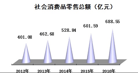 全年社会消费品零售总额688.55亿元,比上年增长14.5%。其中,限额以上企业(单位)消费品零售额464.72亿元,增长17.5%。按经营单位所在地分,城镇消费品零售额527.93亿元,增长16.6%;乡村消费品零售额160.61亿元,增长8.0%。按消费形态分,餐饮收入123.75亿元,增长11.8%;商品零售564.8亿元,增长15.0%。