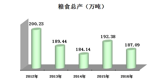 全年粮食总产187.09万吨,比上年减少5.29万吨,下降2.8%。其中,夏粮产量100.23万吨,下降3.0%;秋粮产量86.85万吨,下降2.4%。主要粮食产品中,小麦产量100.12万吨,下降3.0%;玉米产量82.81万吨,下降2.5%。全年棉花产量110吨,下降10.6%;油料产量5.04万吨,下降2.8%;蔬菜产量443.07万吨,增长2.0%。