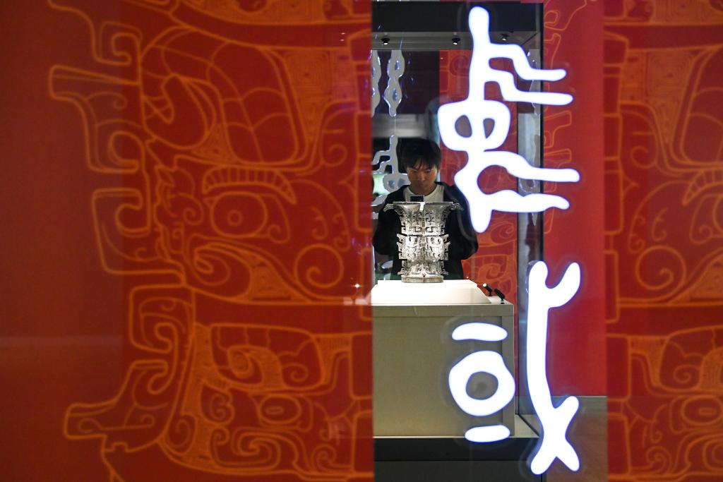 近日,游客在宝鸡青铜器博物院参观何尊。新华社记者 邹竞一 摄