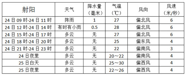 随着降水系统东移南压,降水进一步减弱,24日上午阵雨并渐止;24日下午到25日以多云天气为主。