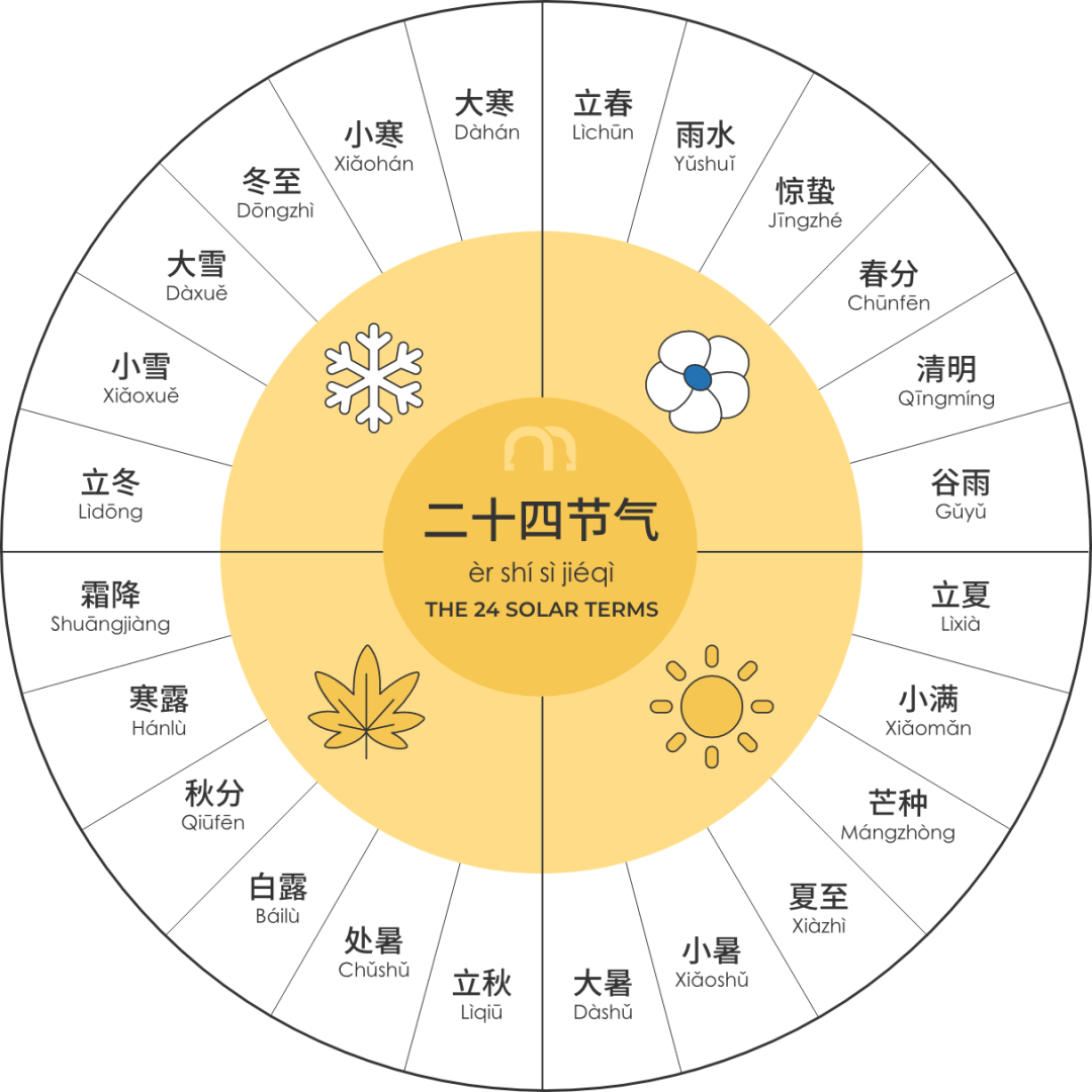 The 24 Solar Terms, or 二十四节气 (èr shí sì jié qì), is a traditional Chinese calendar system that divides the year into 24 periods, each lasting about two weeks.