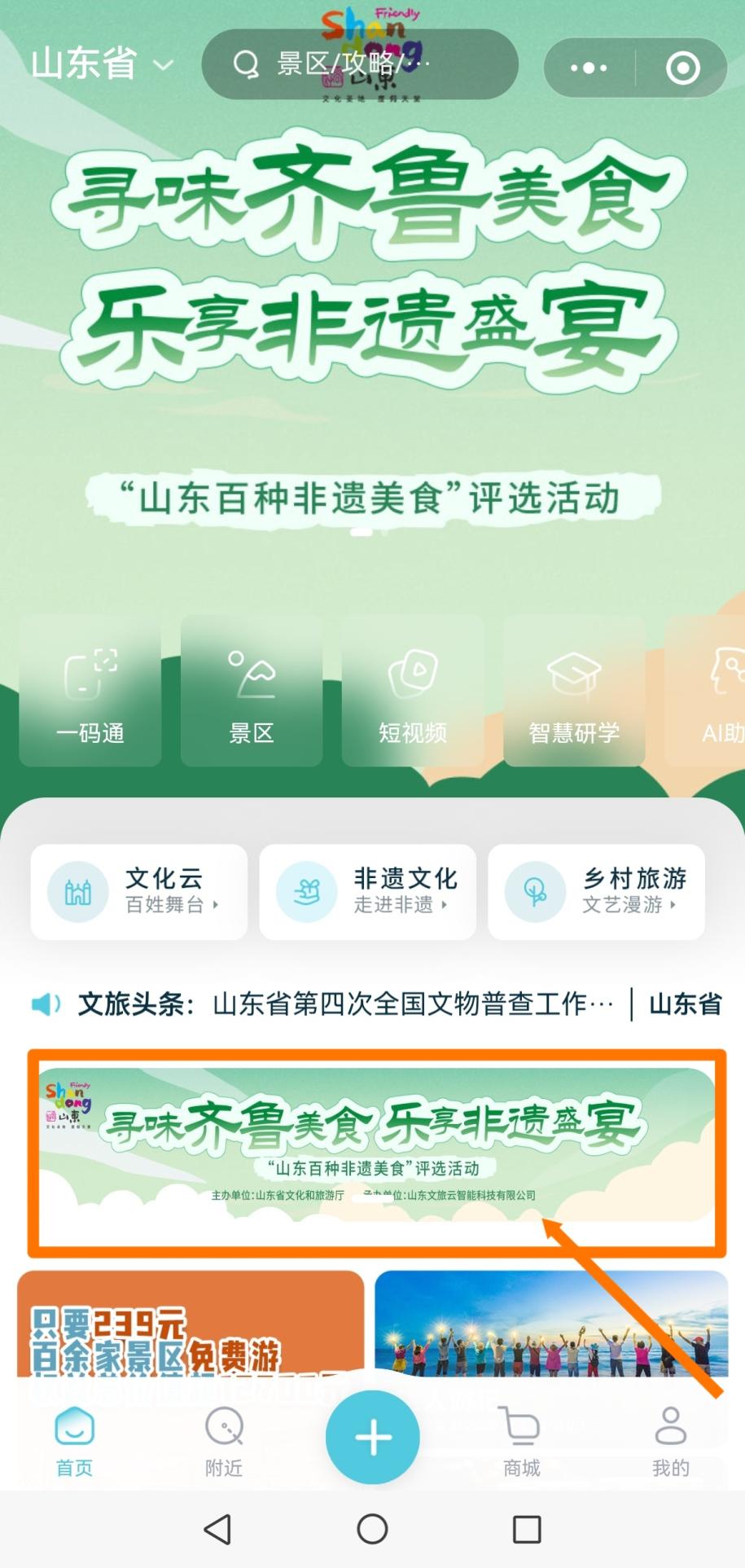 1、搜索“云游齐鲁”小程序,点击“山东百种非遗美食”评选界面,进入投票通道。