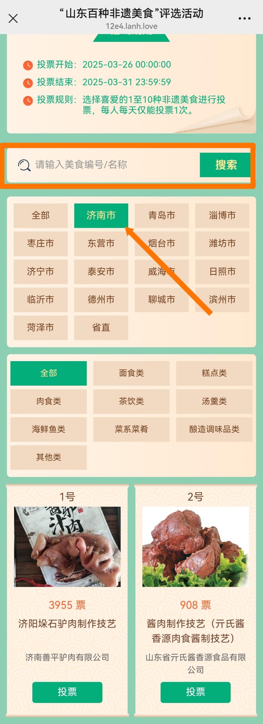 2、投票界面设置省直和16地市模块,选择“济南市”模块进行菜品查看,或者在“美食名称查询”板块输入美食名称,为其投票。