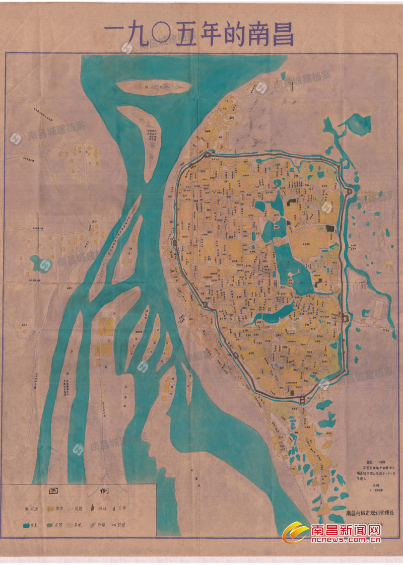 地图右下角的说明揭开了它神秘的身世:“原图在南昌十中教学楼地基中挖出,记载于1905年埋入,地图比例为1:10000,由南昌市城市规划管理处1980年7月复制。”