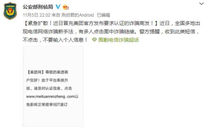 2019年4月,有商户收到号称来自“美团官方服务中心”的短信,短信称系统检查到店铺违规,需点击链接处理,否则将被关闭。