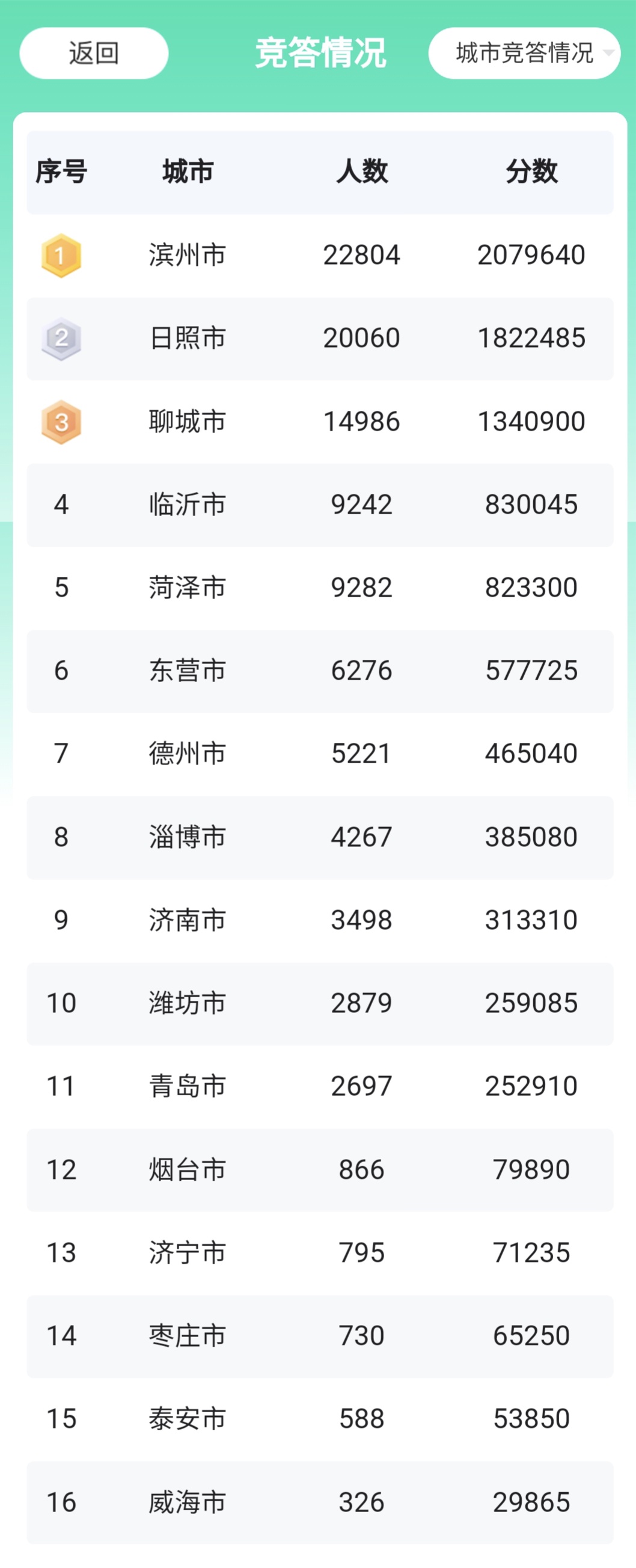 畅享知识竞答,拥抱健康生活。6月10日,山东省全民健康素养宣传月有奖知识竞答活动启动。截至6月26日8:54,城市竞答参与度前三分别为滨州市、日照市、聊城市,其中滨州市参与人数最多,达22804人,答题总分达2079640分,日照市人数也突破两万人,分数突破182万分。值得注意的是,与昨日城市竞答情况相比,临沂市答题人数增加683人,分数突破83万分,升至排行第四,答题劲头上涨。
