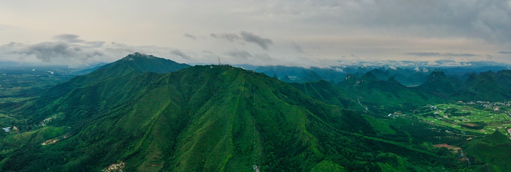 或 【如意峰索道缆车】,远处峰林层峦叠嶂、层次分明,阳朔新城美景尽收眼底,山顶圆形观景台是整个桂林做户外团建活动最美的地方!