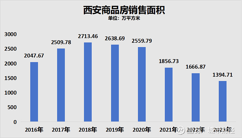 西安新房成交量2018年见顶之后,一路下滑。并且从2021开始大幅下滑,2023年线的新房成交面积1394.71万平方米,只有2018年的一半。