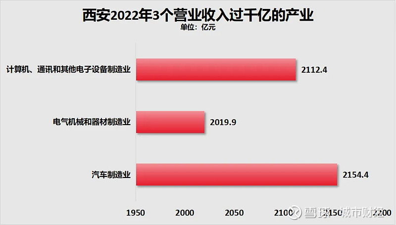 此外,西安统计局披露,在千亿产业数值上只有3个,一个是计算机、通信和其他电子设备制造业,一个是汽车制造业,一个是电气机械和器材制造业。
