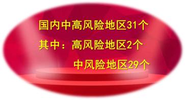 截至2021年11月2日9时,国内现有疫情中高风险地区31个,其中:高风险地区2个(内蒙古阿拉善盟额济纳旗达来呼布镇镇区、北京昌平区北七家镇宏福苑社区),中风险地区29个(甘肃兰州市城关区云祥小区、雁北路天庆丽舍小区、东湖小区,张掖市甘州区锦绣嘉苑(梁家墩镇六号村)、龙王庙小区;内蒙古锡林郭勒盟二连浩特市锡林社区、西城社区、额仁社区、阿拉善左旗巴彦浩特镇新华街道、呼和浩特市金川开发区碧水蓝山小区、新城区华侨新村小区;宁夏银川市金凤区森林半岛小区、兴庆区太阳都市花园小区、西夏区物华兴洲苑小区;贵州遵义市汇川区仁和苑小区、汇川区东方湘江湾小区;北京昌平区东小口镇森林大第家园社区;山东日照市五莲县洪凝街道学府壹号小区;黑龙江黑河市爱辉区长海社区盛泰小区76号楼5单元、人保财险社区林业集资楼1号楼4单元、博文社区尚品佳苑小区、博文社区昌辉雅典城小区、鹿源春社区宏志小区、长海社区盛泰小区、哈尔滨市香坊区恒大时代广场一期、平房区绿色新城西区、国际花都一期;江西上饶市铅山县葛仙山镇;河北石家庄市深泽县河庄村。