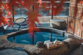 山海间温泉度假区:山海间温泉度假区共有10间客房以及68个院落,每个院落有3间客房以及1个室内温泉泡池可满足一家六口的住宿需求。