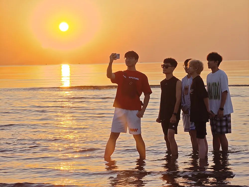看日出,红日浴海奇观;听歌会,挥洒青春时光;退潮时提小桶赶海,礁石缝抠小螃蟹,沙滩写大字被浪卷走......青春就要这么嗨!