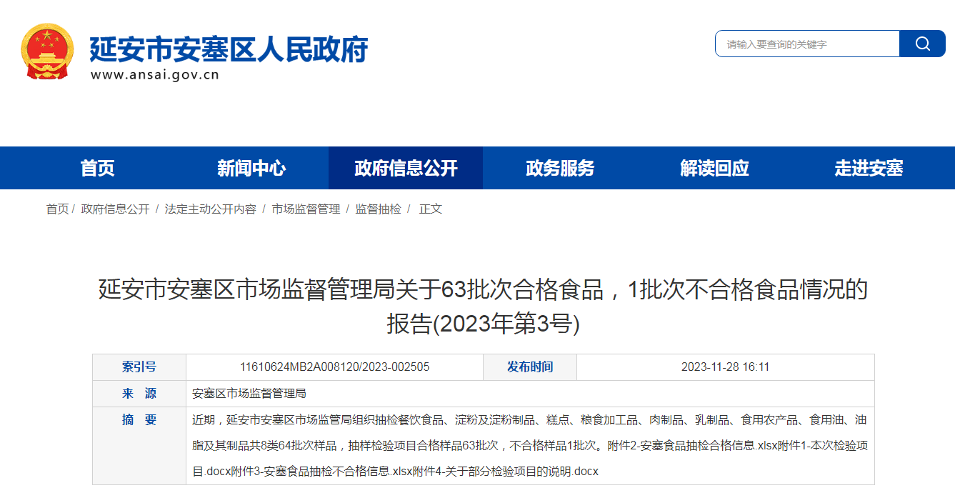 延安市安塞区市场监督管理局关于63批次合格食品,1批次不合格食品情况的报告(2023年第3号)