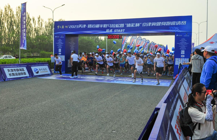 6月18日,2023天津·团泊湖半程马拉松暨“体彩杯”京津冀健身跑邀请赛在团泊湖畔的天津健康产业国际合作示范区鸣枪开跑。天津市体育局局长、党组书记李克敏,静海区委书记刘春雷,区委副书记、区长曲海富出席,沧州市体育局副局长刘海照受邀参加,洋河股份天津事业部总经理朱醒,天津天奥体育产业有限公司总经理胡继东参加开幕式。