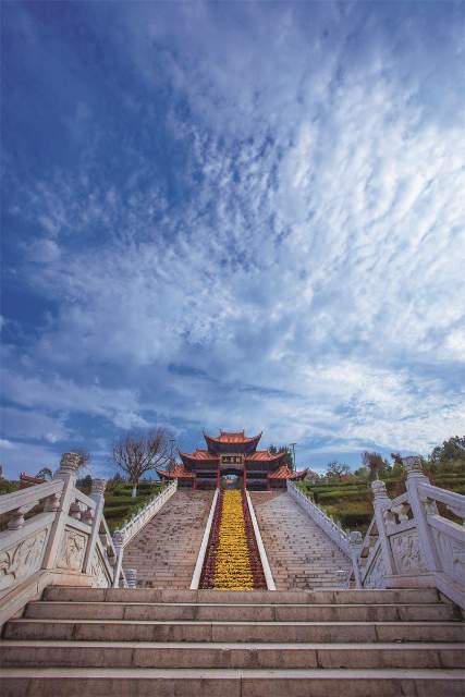 到锦屏山风景区,踏上1999级阶梯,感受“一览众山小”的空旷视野,目光所及之处是蔚蓝的天和纯白的云。