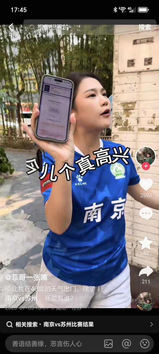 “菲哥一张嘴”最新一条视频更新于7月5日下午4时半,她穿着南京的队服准备去看今晚南京对决苏州的赛事。