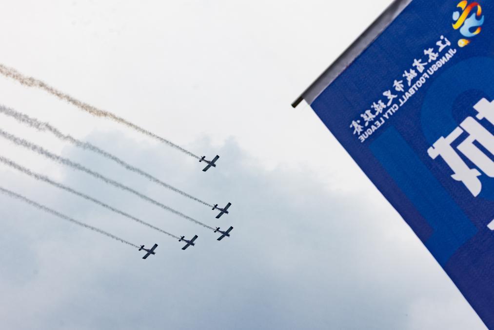 6月14日,比赛开始前,飞行编队飞过赛场上空。当日,在江苏扬州举行的2025江苏省城市足球联赛第四轮比赛中,扬州队主场1比1战平泰州队。新华社 图
