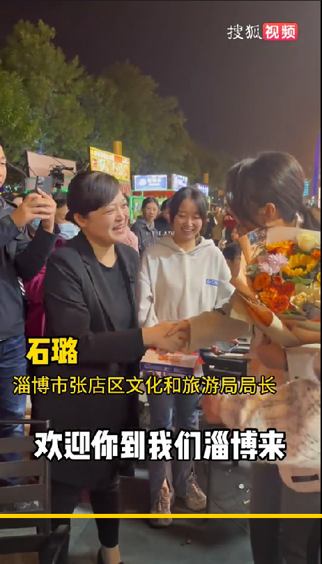 淄博市张店区文化和旅游局局长石璐赶到了吴菲等人所在的烧烤摊,递上了鲜花,伸出了欢迎的双手:“欢迎你到我们淄博来。”