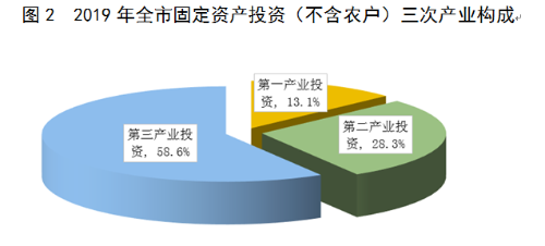 固定资产投资按产业分,第一产业投资比上年增长9.2%;第二产业投资增长36.7%;第三产业投资下降5.9%。