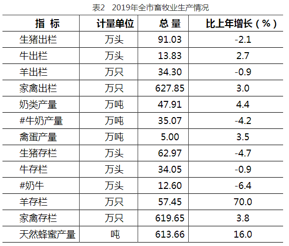 全年畜牧业生产形势稳定,主要畜牧产品产量、畜禽存栏保持平稳。