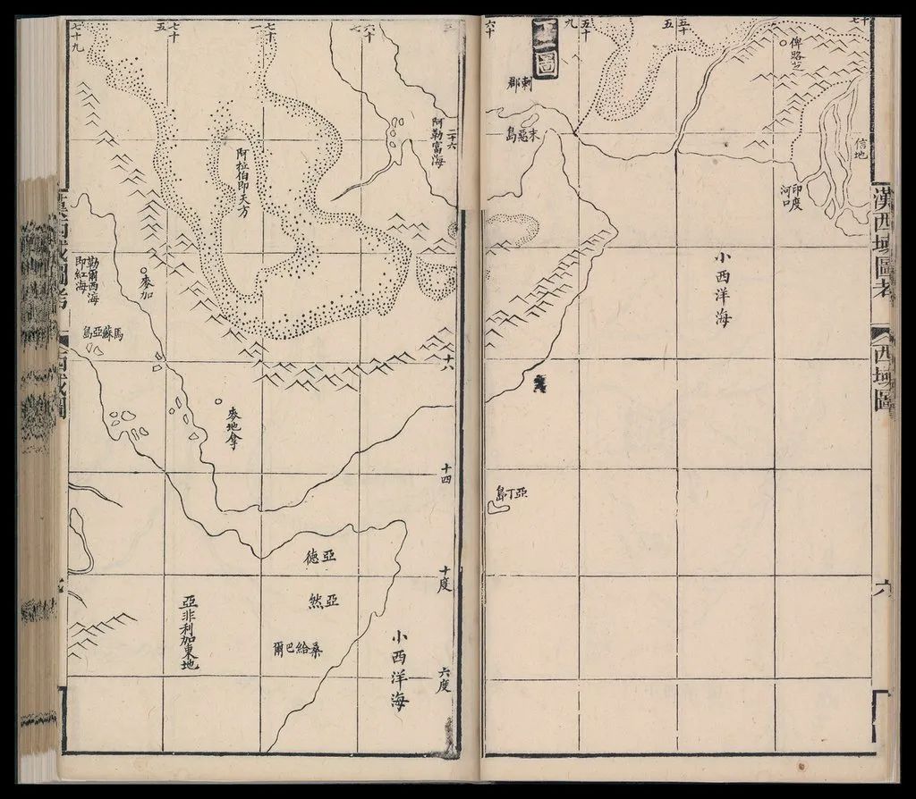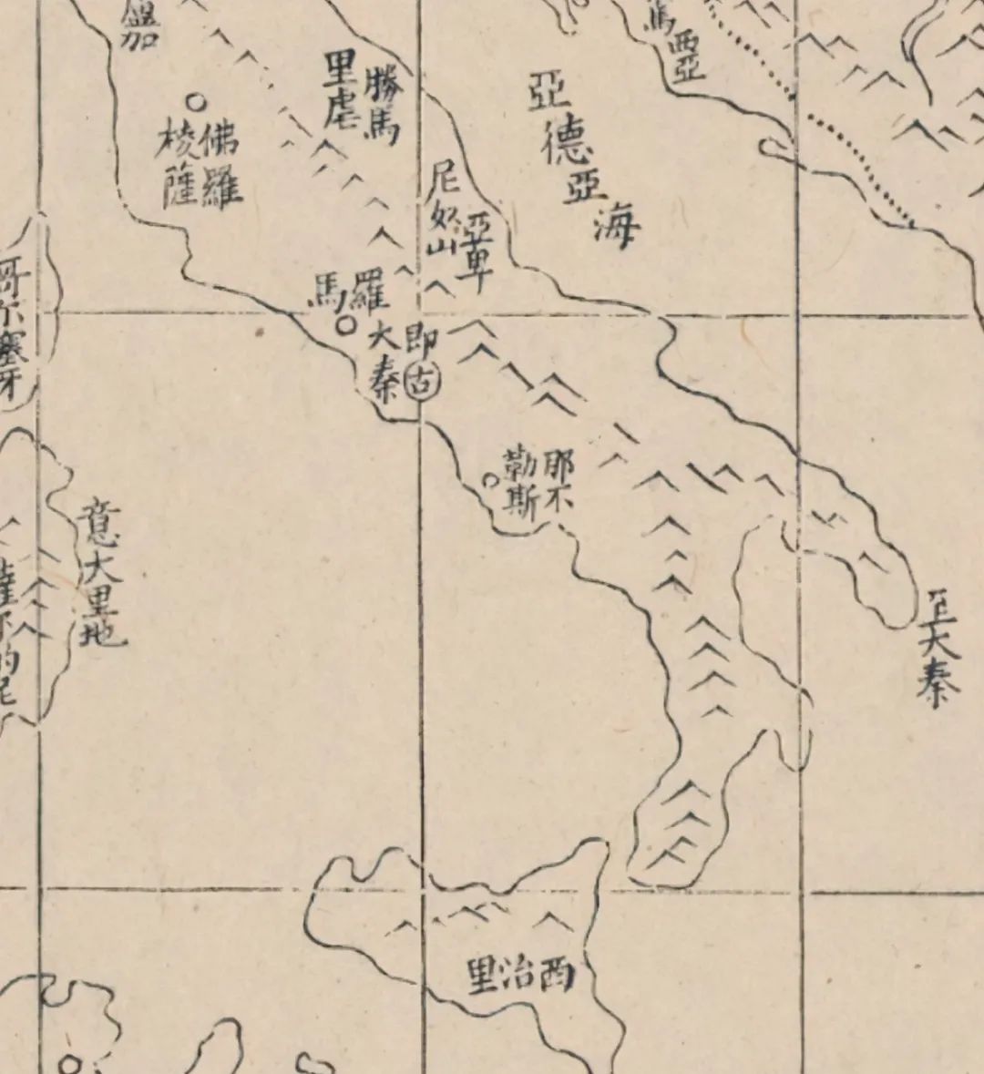 除了汉代人探索过的西域世界,这份地图体现了绘制者的世界眼光,超越了汉代狭义上的西域----塔里木盆地,还囊括了广义上的西域,包括中亚,南亚,还有西亚,乃至地中海以西的欧洲大地,比如在阿拉伯半岛上,绘图者就写明了这里是古代的“天方”;在亚平宁半岛南部,作者写明了这里通往古代的“大秦”。